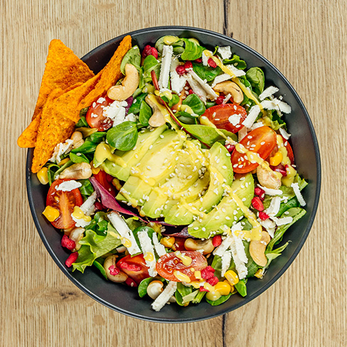 mit Feldsalat, Römersalat, Cherrytomaten, Mais, Schafskäse, Avocado, Tortilla, Cashewkernen, Granatapfel und Honig-Senf-Dressing